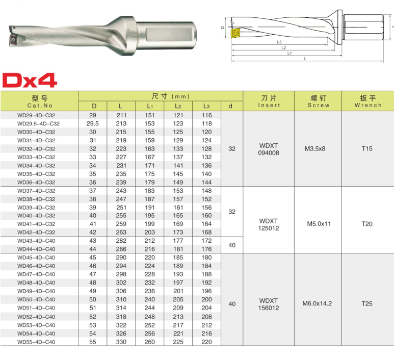 WDX型 4倍径 40mm直径 U钻 WD40-4D-C32