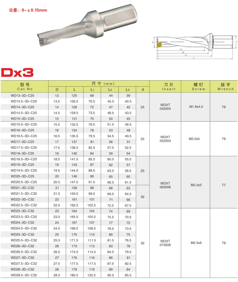 WDX型 3倍径 15mm直径 U钻 WD15-3D-C25
