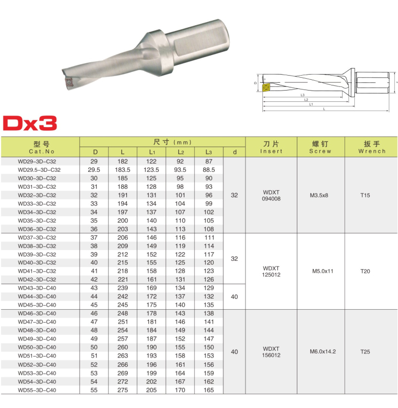 WDX型 3倍径 40mm直径 U钻 WD40-3D-C32