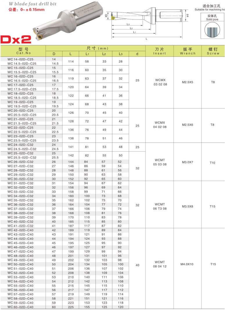 WC15.5-02D-C25 15.5 mm直径 WCMT刀片 2倍径 U钻