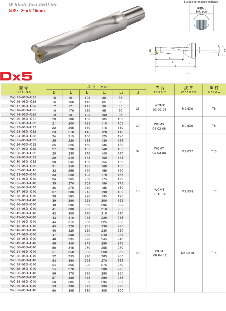 WC52-05D-C40 52 mm直径 WCMT刀片 5倍径 U钻