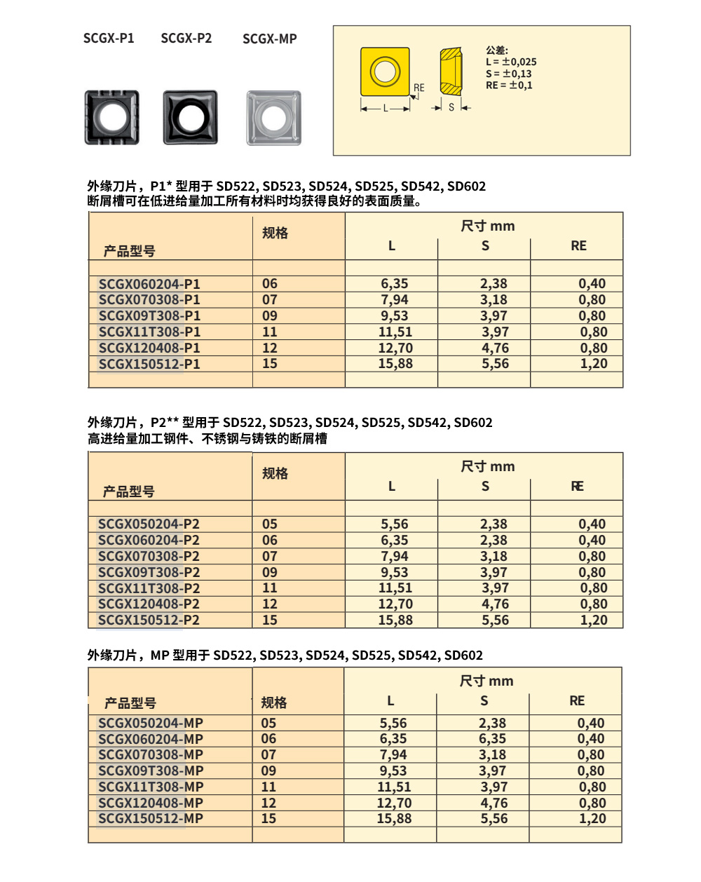外缘刀片,P2槽型高进给量加工钢件、不锈钢与铸铁的断屑槽。用于 SD522, SD523, SD524, SD525, SD542, SD602快速钻头。