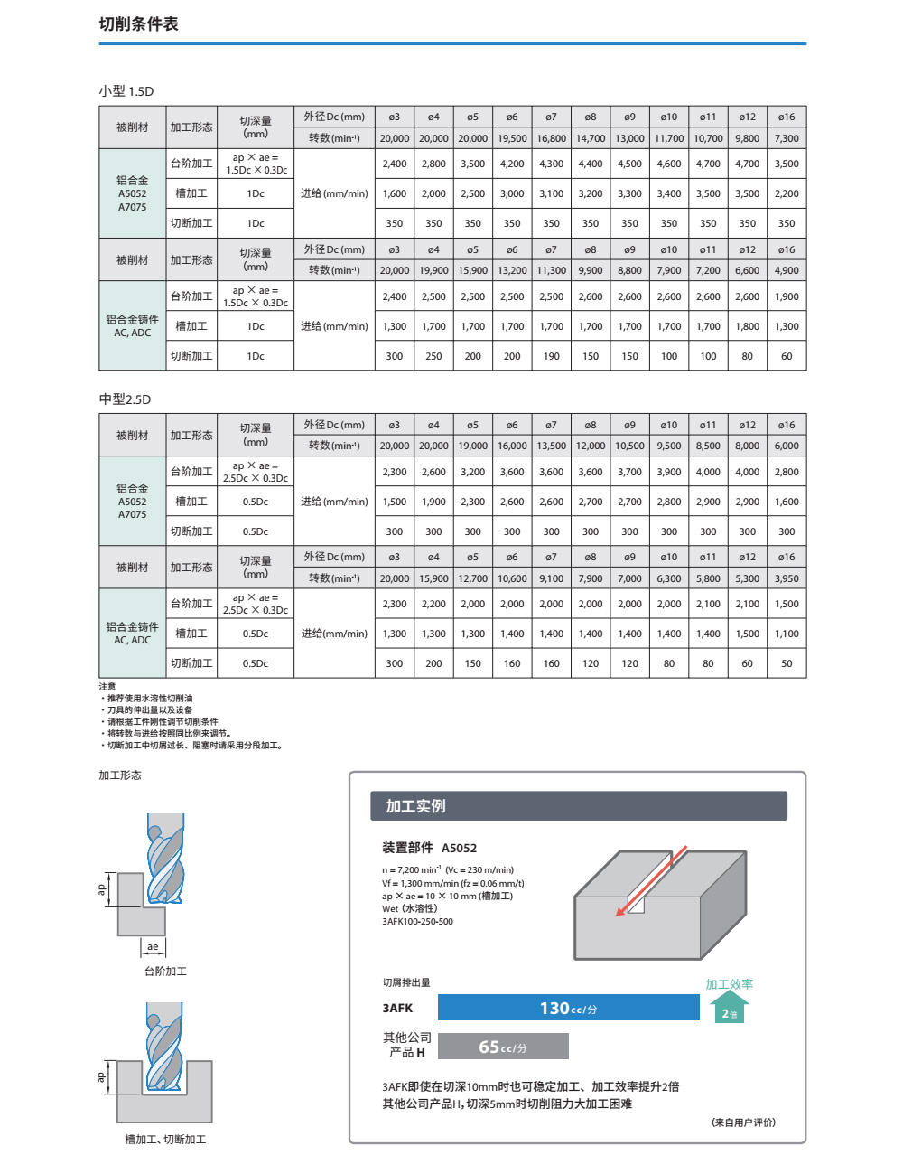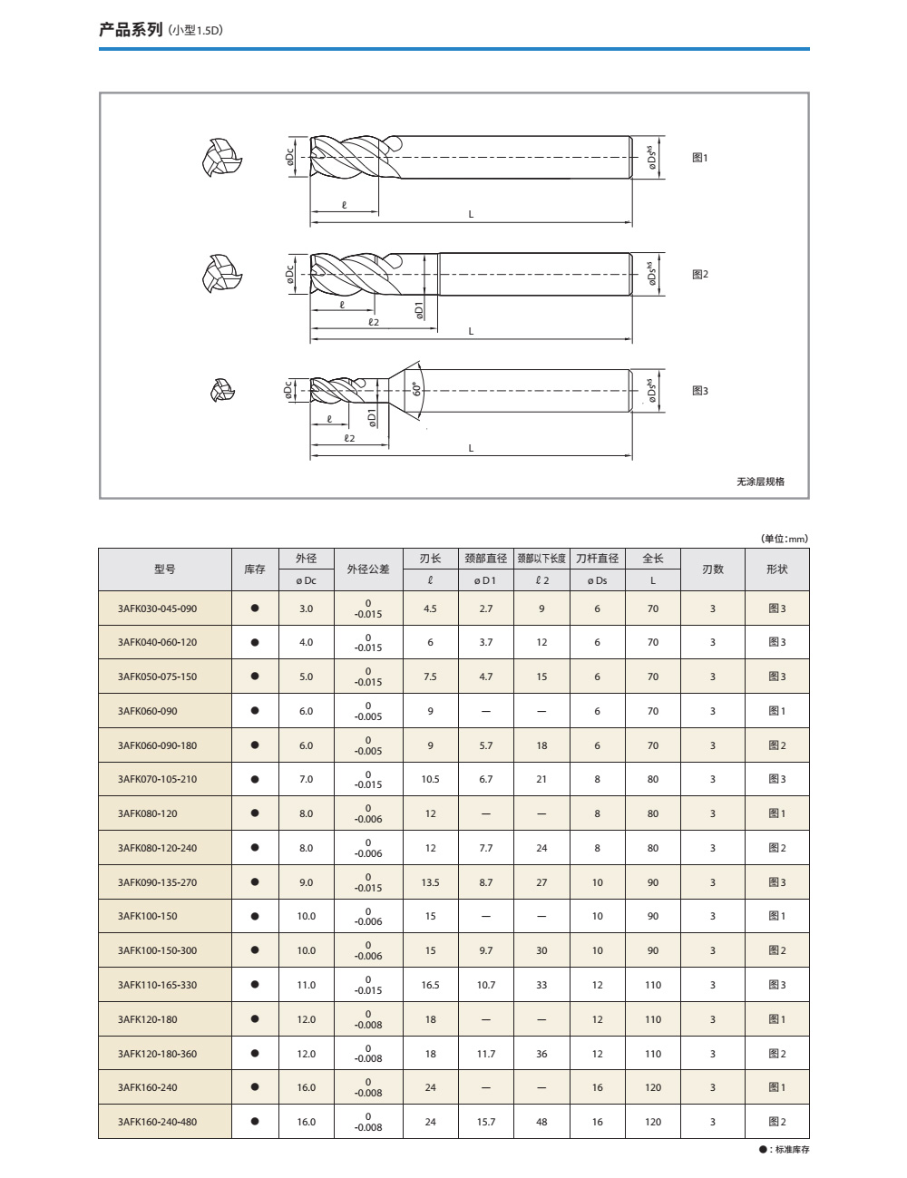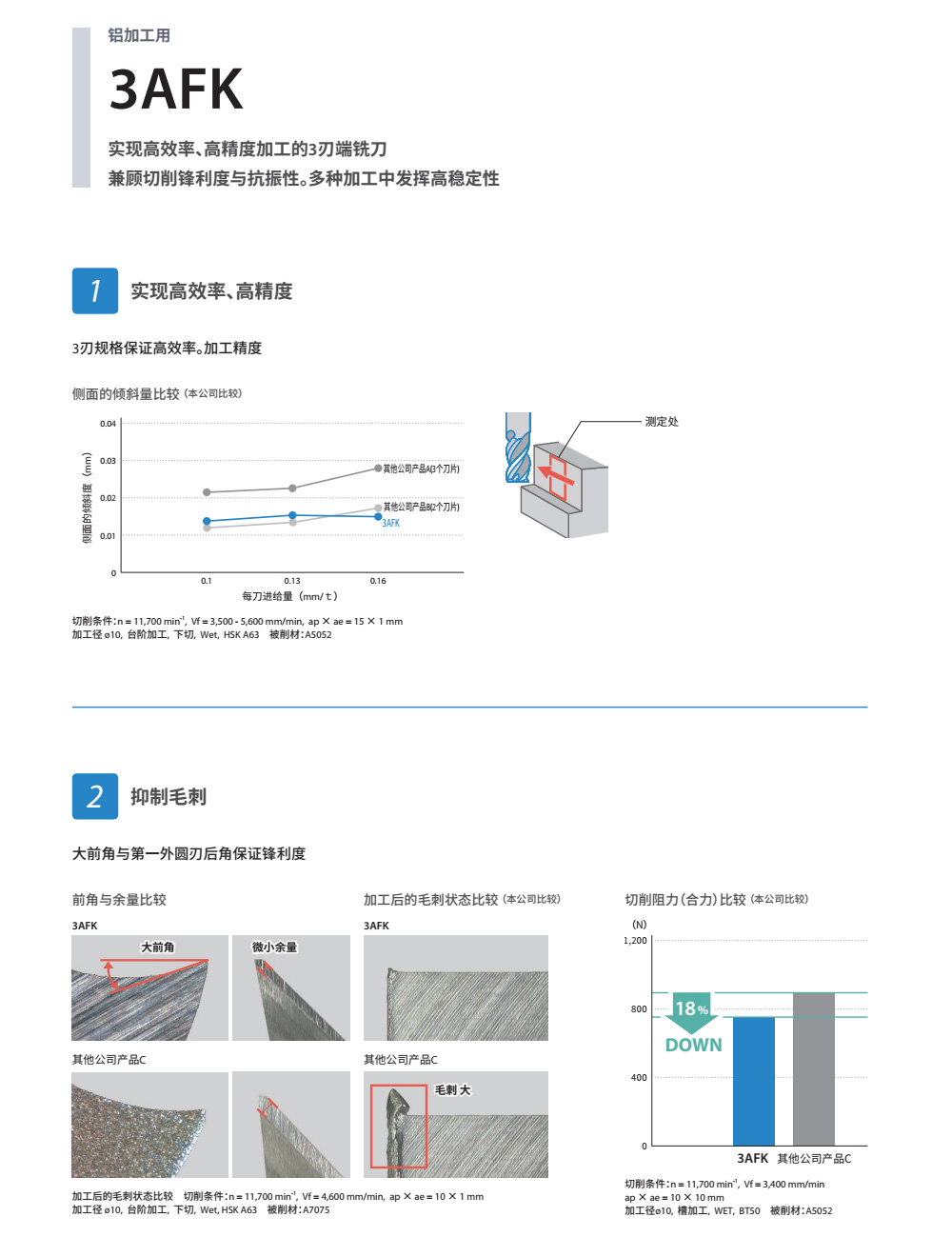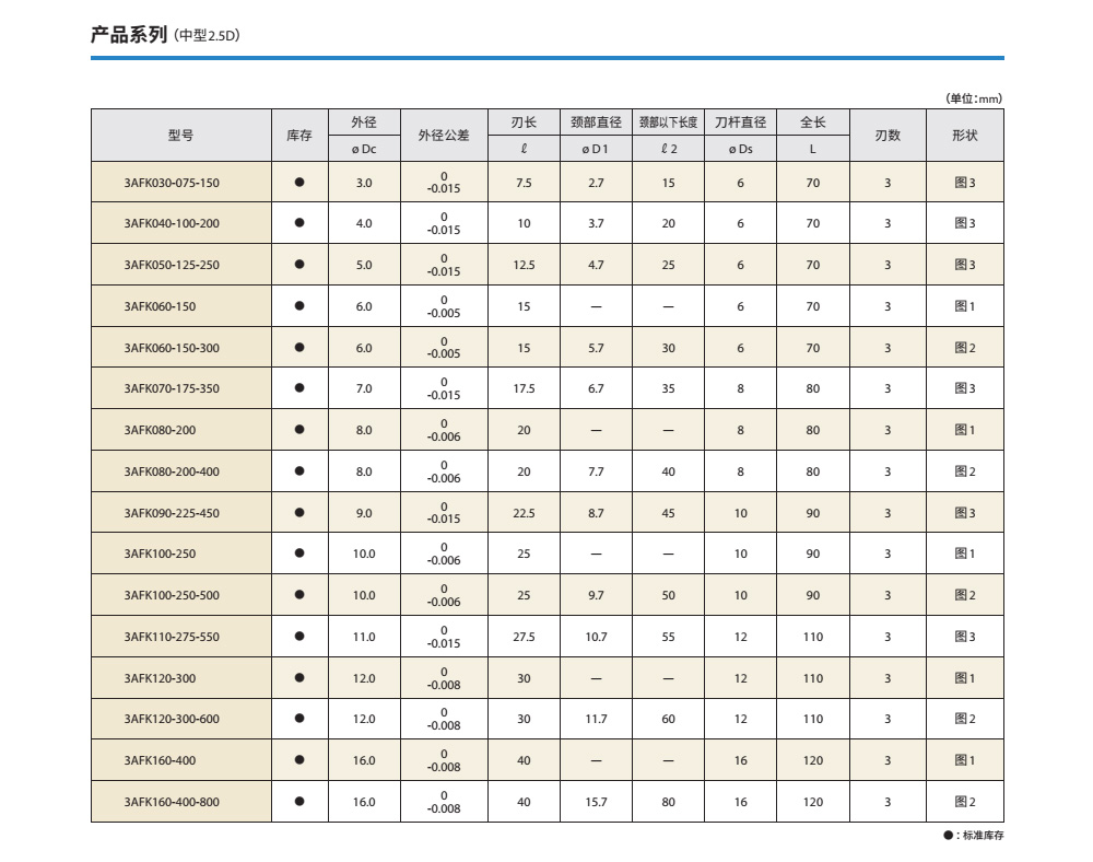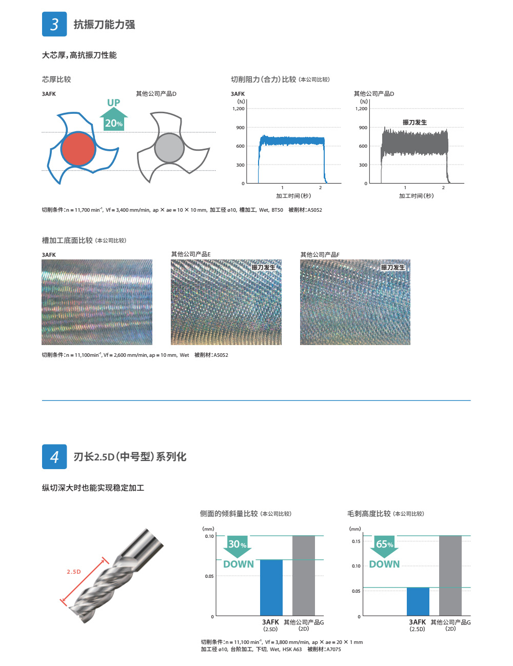 3刃规格保证高效率。优良的加工精度;抑制毛刺大前角与第一外圆刃后角保证优良的锋利度;大芯厚,高抗振刀性能;刃长2.5D(中号型)系列化,纵切深大时也能实现稳定加工。