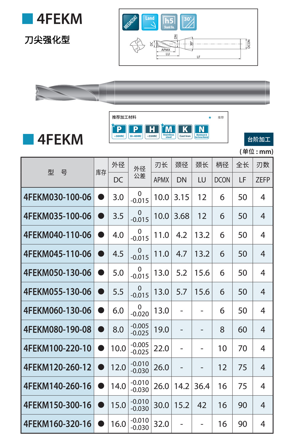 30度螺旋角刃尖强化型四刃立铣刀4FEKM系列,推荐加工HRC30钢件、不锈钢,也可加工HRC40钢件、铸铁、铝合金及HRC55度淬火钢