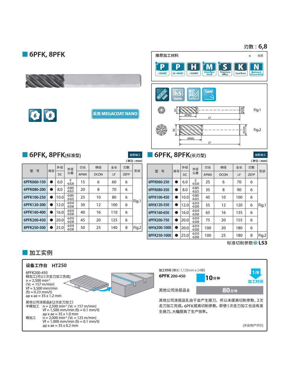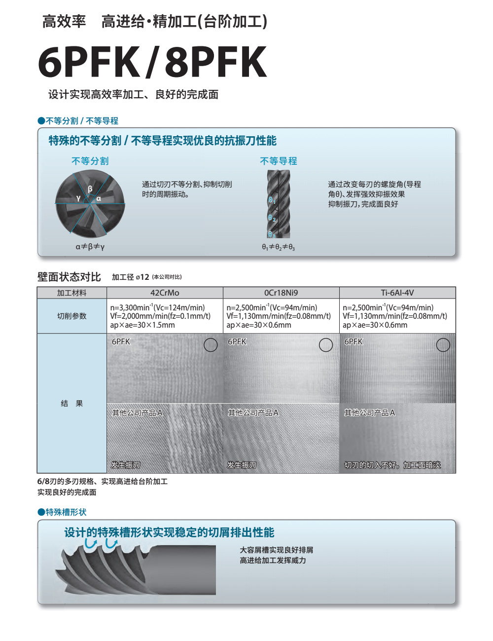 6刃/8刃的多刃形式6PFK / 8PFK高效率多刃立铣刀,可实现台阶加工的高进给、高效率加工。40-42度螺旋角不等分割 不等导程的设计,实现优良抗振性能,高精度涂层并广泛对应不同被加工材料。新型特殊断屑槽形状实现稳定切屑排出性能,高进给也能实现优良加工面。推荐加工HRC30度钢件、不锈钢、钛合金,也可加工hrc30-40度钢件、HRC55淬火钢、铸铁、铝合金。