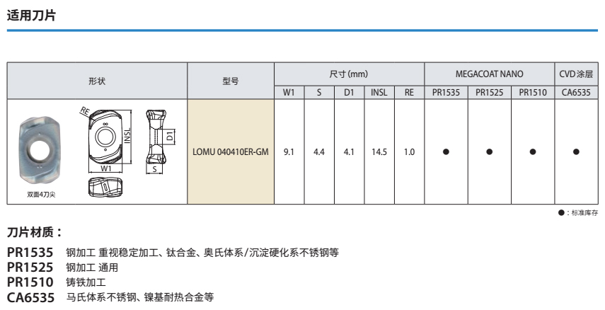 | MFH Boost高进给立铣刀片 | LOMU 040410ER-GM CA6535 | 日本JC | 马氏体系不锈钢、镍基耐热合金等 | CA6535 | 在线联系 |