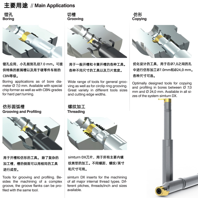 SIMTEK逗号刀片,SIMTURNDX产品有 硬质合金刀杆 钢制刀杆 端面刀杆、适配刀片有内孔车刀片、切槽刀片、深槽刀片、圆弧槽刀片、公制螺纹、英制螺纹、55度螺纹、梯形30度螺纹刀片、反镗刀片、端面槽刀片。