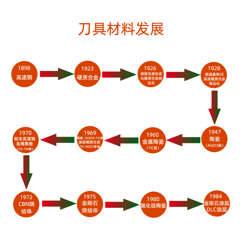 1926年,德国克鲁博公司(Friedlich Krupp)成功地完成了硬质合金的商品化,并冠以“Wie diamant(意为像金刚石一样坚硬)”的名称在市场上销售。随后,在1928年,美国的通用电气公司(General Electric)也以“Carboloy”的名称推出了同样的产品。同一时期,日本的东芝(现TUNGALOY)、住友电工(现住友电工HARDMETAL)、三菱金属(现三菱综合材料)等公司也都在积极推动相关的研究,开始走上工业化的道路。 在此后70余年的发展中,人们相继制造出涂层、陶瓷、金属陶瓷、超高压烧结体等新型材料。Z近,又出现了一种在硬质合金基体的表面生成金刚石结晶的技术。随着切削工具材质的不断更新,切削速度也实现了飞跃性的提高。