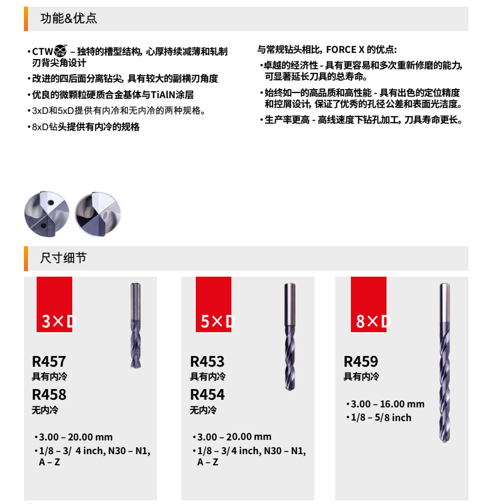 FORCE X 整硬合金钻头是为高性能钻削应用而开发的,适用于多种加工材料,如高达1500 MPa的合金钢,碳钢和铸铁。FORCE X 钻头在不锈钢和铝合金材料的应用上,也表现良好,使其成为通用钻削加工的理想选择。