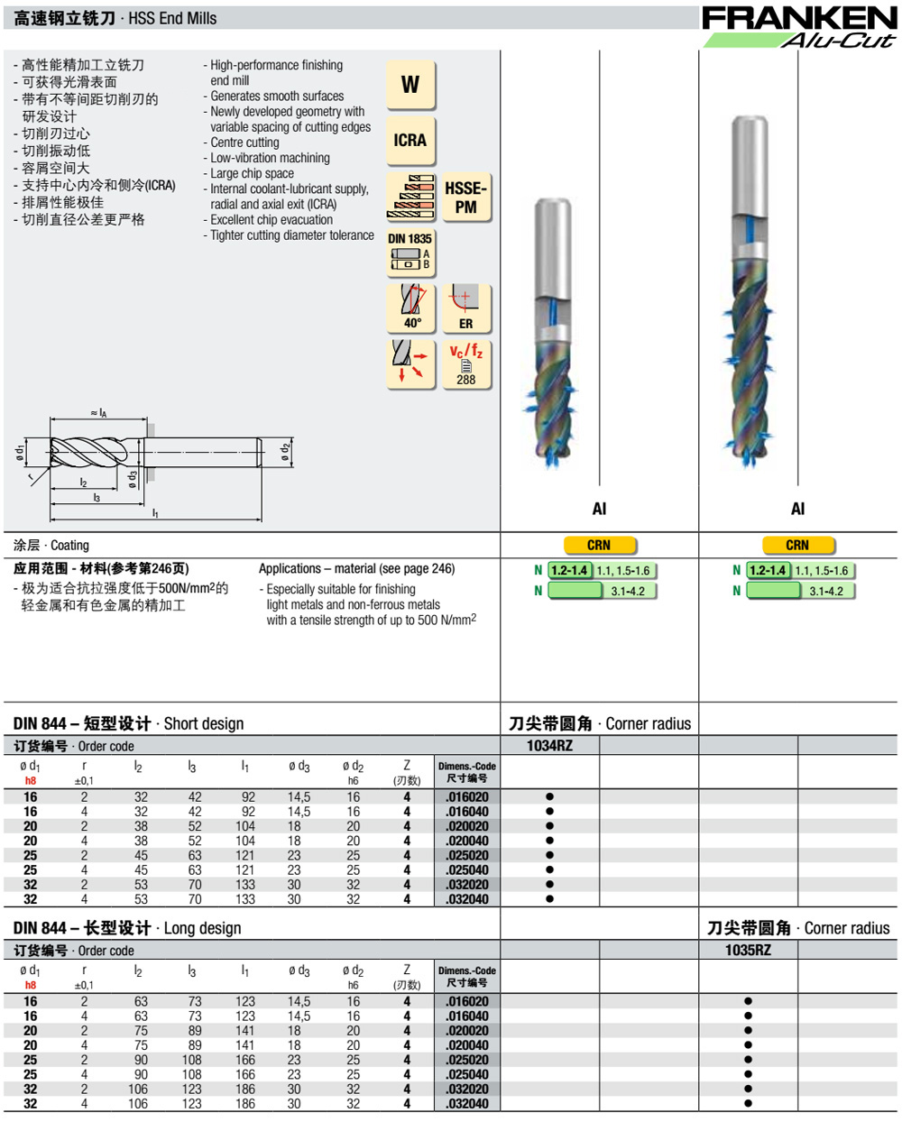HSSE-PM Alu-Cut粉末含钴高速钢中心内冷和侧冷圆弧铣刀1034RZ/1035RZ 铝合金加工