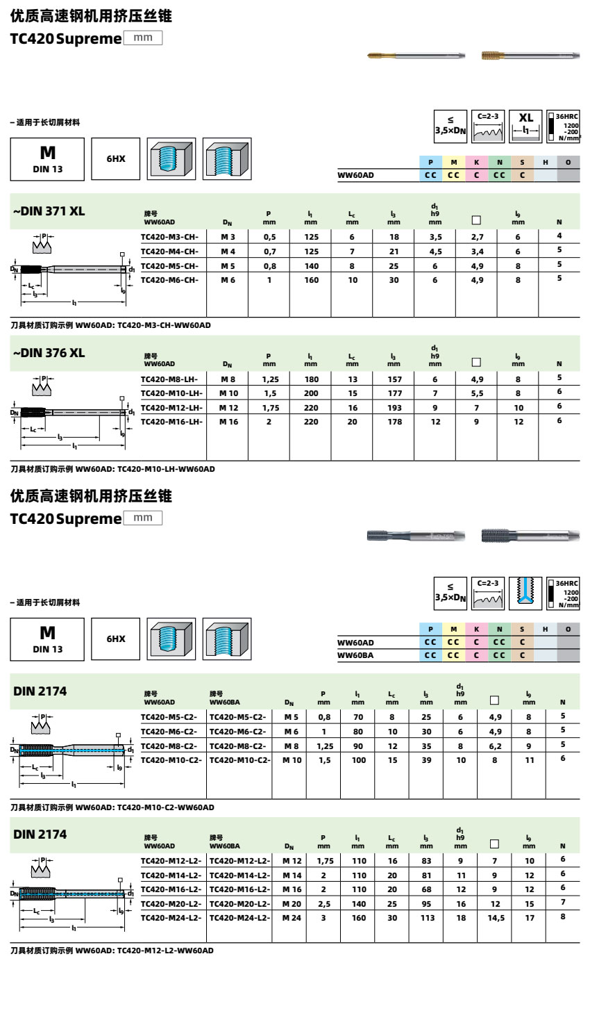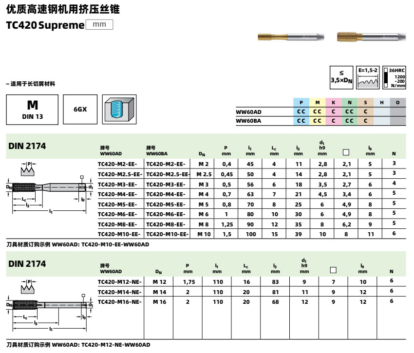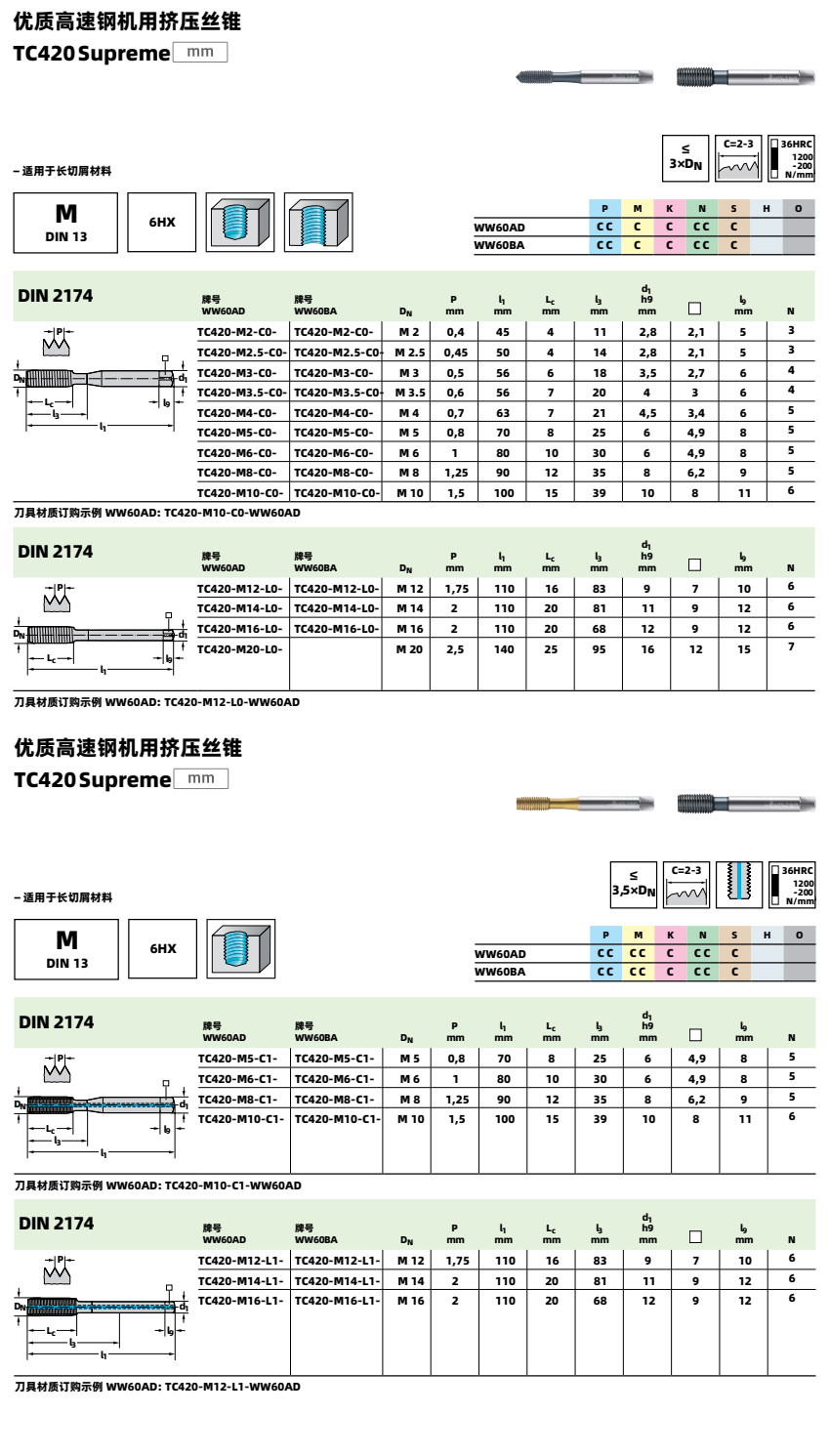 高速钢机用挤压丝锥 TC420 适合加工HRC36以下钢件、不锈钢、铝合金、铸铁