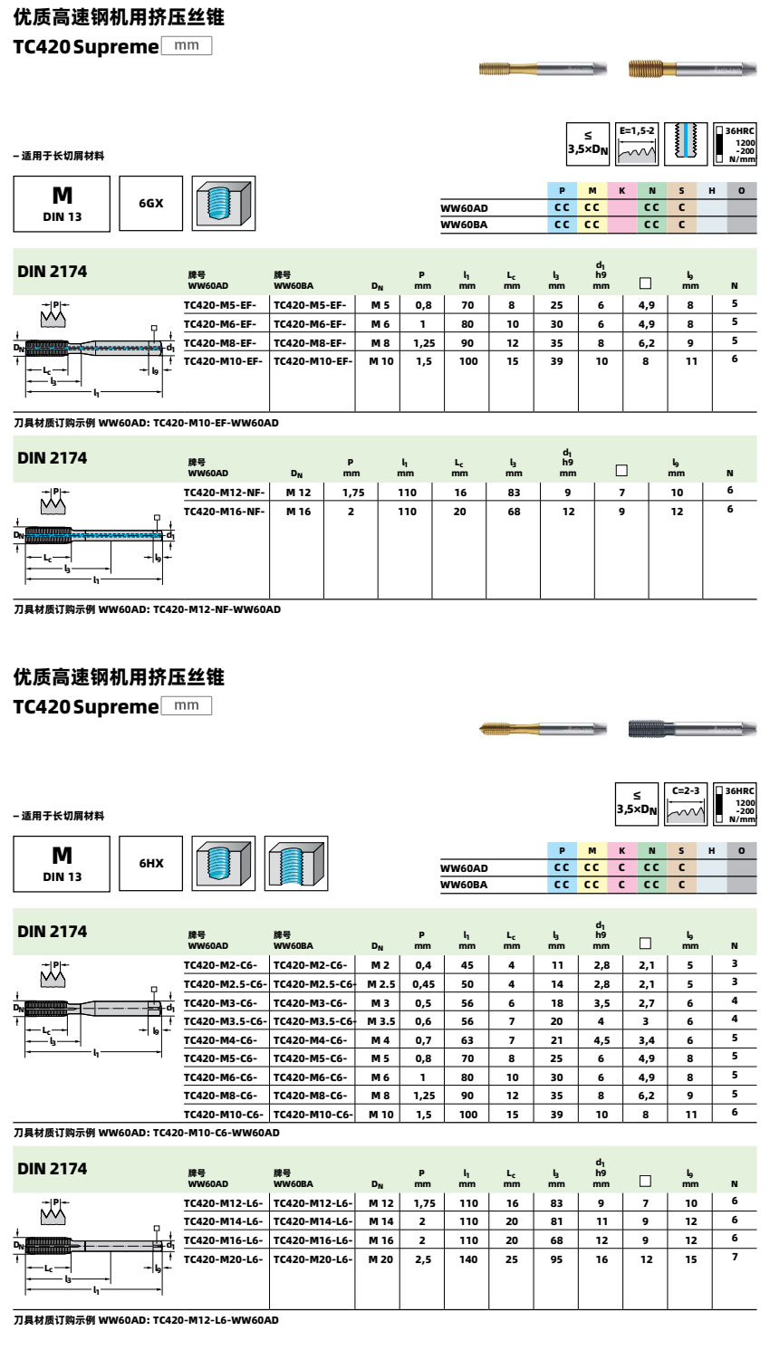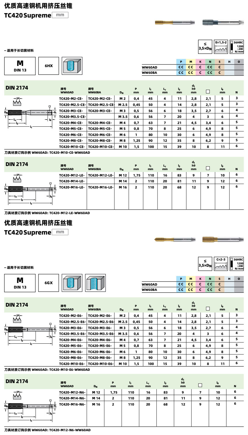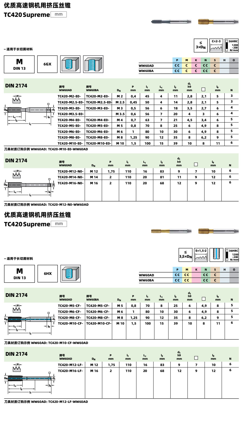 如果您需要采购内冷出水M16x2高速钢机用挤压丝锥TC420-M16-L1-WW60AD,可以联系我们,我公司可以提供该产品型号的具体产品参数、样本资料,并为您提供一个好的价格。任何攻丝工序的成功都取决于会影响成品质量的许多因素。为了成功完成您的工序,请将以下提示牢记于心: 1. 从材料分类表中选择其设计适合零件材料和孔型 ( 即通孔或盲孔 ) 的正确丝锥。 2. 确保零件牢固夹紧 - 侧向移动可能导致丝锥破裂或螺纹质量不理想。 3. 从相关样本页选择正确尺寸的钻头。请记住,用于挤压丝锥的钻头尺寸是不同的。错误选择或恶劣的钻孔条件可能导致工件材料加工硬化,从而降低丝锥的性能。 4. 选择样本产品页上和引导产品搜索中所示的正确切削速度。 5. 将适当的切削液用于正确的应用。 6. 确保丝锥向孔中平稳进刀,因为不均匀的进给可能产生 “ 喇叭口 ”。