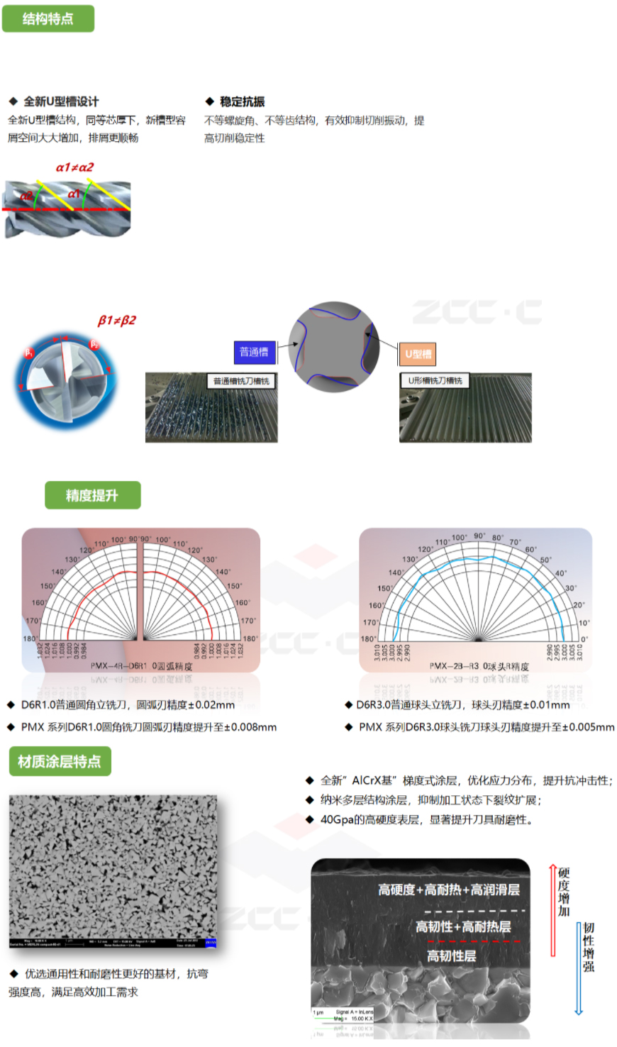 广泛适用于模具、汽车行业碳素钢、合金钢、模具钢、预硬钢等材料的干切、水冷、MQL冷却条件下高速高效侧铣、槽铣和仿型加工