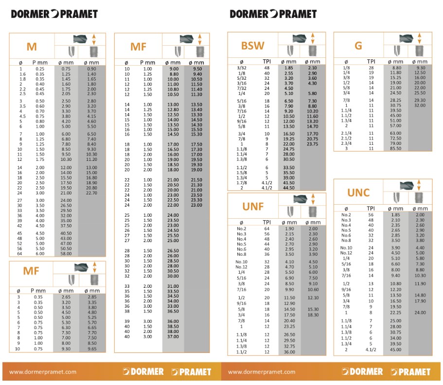 当使用成形丝锥制造螺纹时,需要较大的预钻。这些价值也在海报和表格中提到。您还将始终发现在Dormer目录中相关水龙头的产品页面上说明的预钻尺寸。
